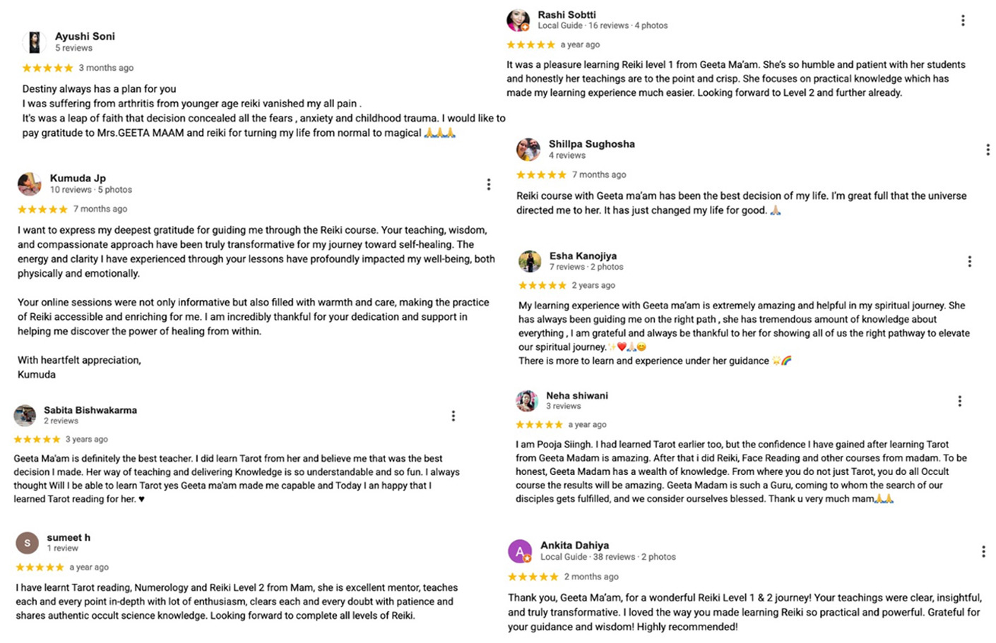 Hi, I'm Geeta Sharma - Reiki Grand Master, Numerologist, Tarot Expert & Spiritual Coach. My work is deeply intuitive, divinely guided, and rooted in ancient Indian healing sciences. Over the years, I've helped thousands of souls realign with their inner light, break through emotional patterns, and step into their true power. Faith Healers is not just a brand-it's a soul-led mission to help you come home to yourself.